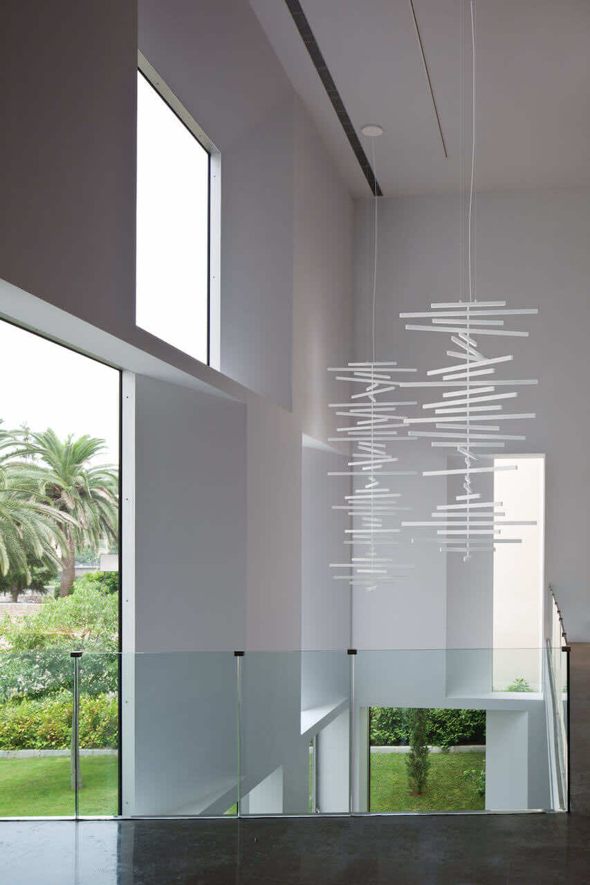 Charakteristisch für die Rhythm von Vibia sind ihre horizontal ausgerichteten Stäbe mit integrierten LED-Bändern, die ein kraftvoll-atmosphärisches Licht erzeugen.