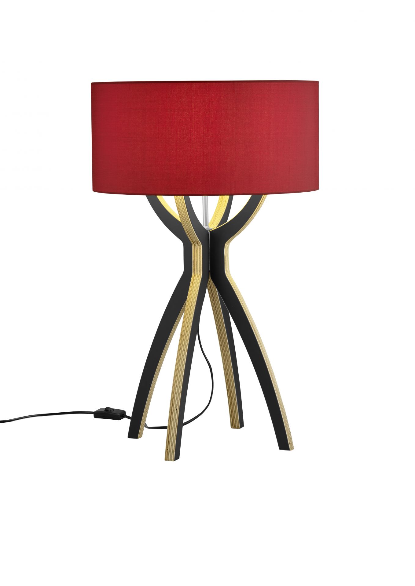 Der runde Textilschirm der Tischleuchte Body ruht auf einem dekorativen, vierbeinigen Gestell aus Multiplex und strahlt das Licht sowohl nach oben und unten als auch seitlich ab. So entsteht eine besonders atmosphärische Beleuchtung.