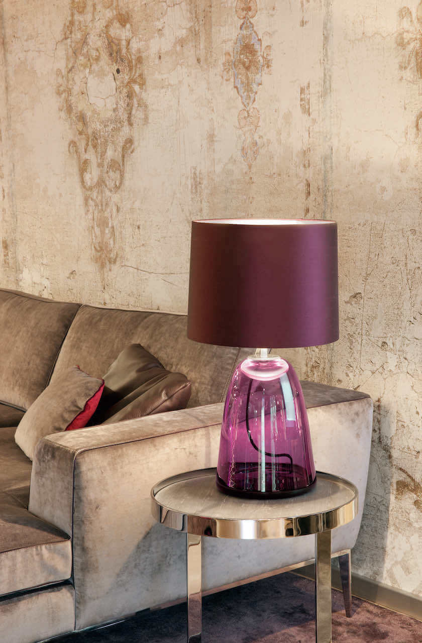 Die Tischleuchte Kelly besticht mit ihrer zeitlos-eleganten Form. Zweifellos das Highlight ist ihr Fuß aus mundgeblasenem Glas, der für ein Plus an Individualität und Atmosphäre sorgt.